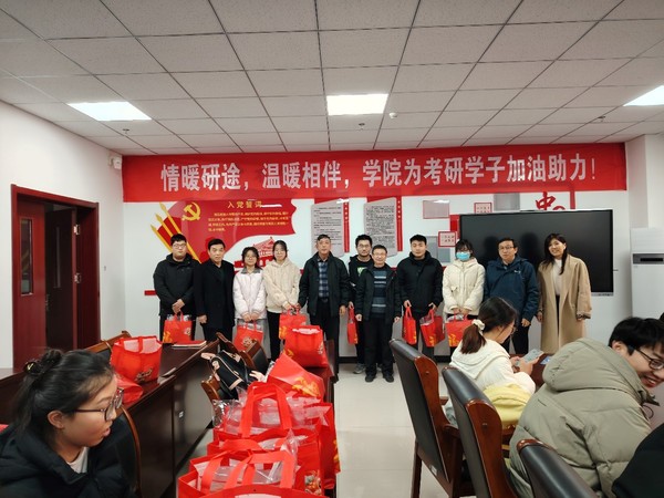 学院党委书记刘宏军向考研学生寄语:希望同学们调整好心态,以最佳的状态进入考研冲刺阶段,学院是同学们坚强的后盾,欢迎同学们在遇到困难时找学院领导、老师寻求帮助,祝愿全体同学考研成功上岸。院长王树臣介绍了学院近期走访调研情况,他表示,学院正积极联系校外导师、学院往届考研上岸的校友,为在校考研同学专业课辅导答疑,便于同学们高效地复习专业课。随后,学院领导为全体考研学生发放了文具套装、热水袋、营养餐包等物资,为同学们考研加油。